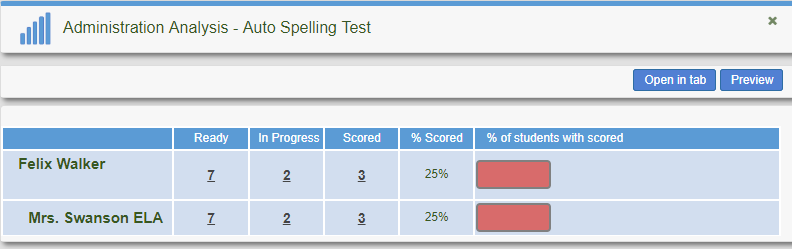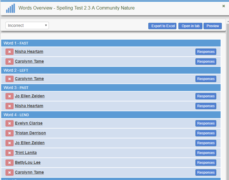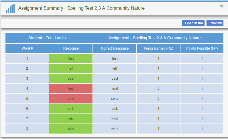 View word list including number of correct and and number of incorrect response for each word for the spelling test or assignment.