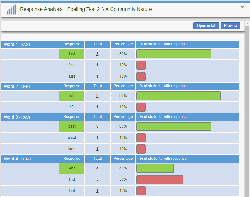 View students’ response including misspellings for each word. This reports helps quickly identify spelling misconceptions.